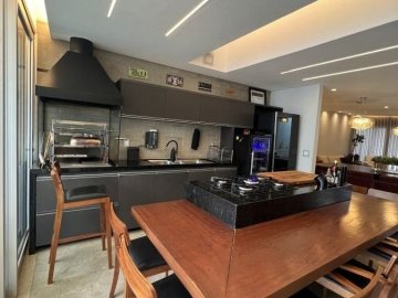 Sala de estar integrada à sala de jantar e área gourmet