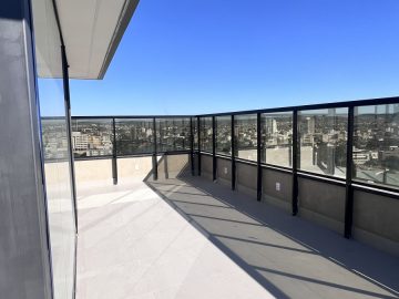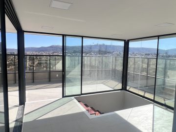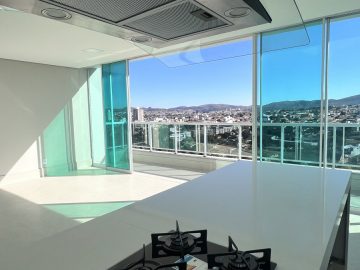 Varanda com portas de vidro e vista